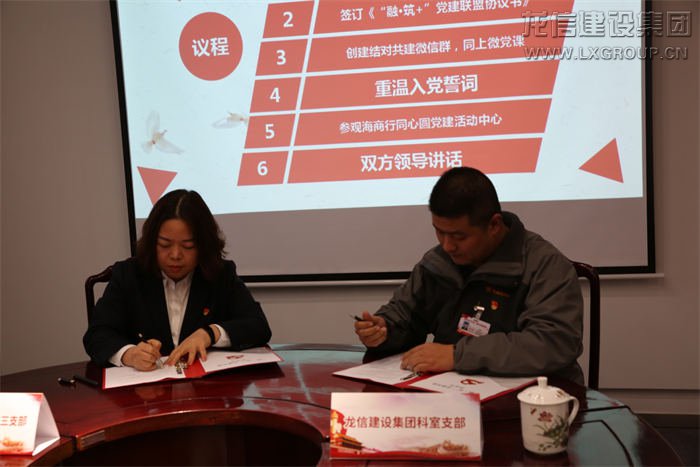 本次活動(dòng)以“融·筑+”黨建結(jié)對(duì)共建為主題,全體黨員共同重溫入黨誓詞,堅(jiān)定理想信念。龍信集團(tuán)科室支部副書(shū)記施金浩與海門農(nóng)商行機(jī)關(guān)第三黨支部書(shū)記劉曉艷共同簽訂《“融·筑+”黨建聯(lián)盟協(xié)議書(shū)》,以“黨建互促、服務(wù)互聯(lián)、專業(yè)互助、資源互享、廉政互督”為原則建立聯(lián)系、加強(qiáng)溝通,實(shí)現(xiàn)信息共享、優(yōu)勢(shì)互補(bǔ)?,F(xiàn)場(chǎng)黨員們共同創(chuàng)建“融·筑+”黨建結(jié)對(duì)共建微信群,同上“微黨課”《讓信仰之光在心中閃亮》。隨后大家重溫入黨誓詞并參觀海門農(nóng)商銀行同心圓黨建活動(dòng)中心。