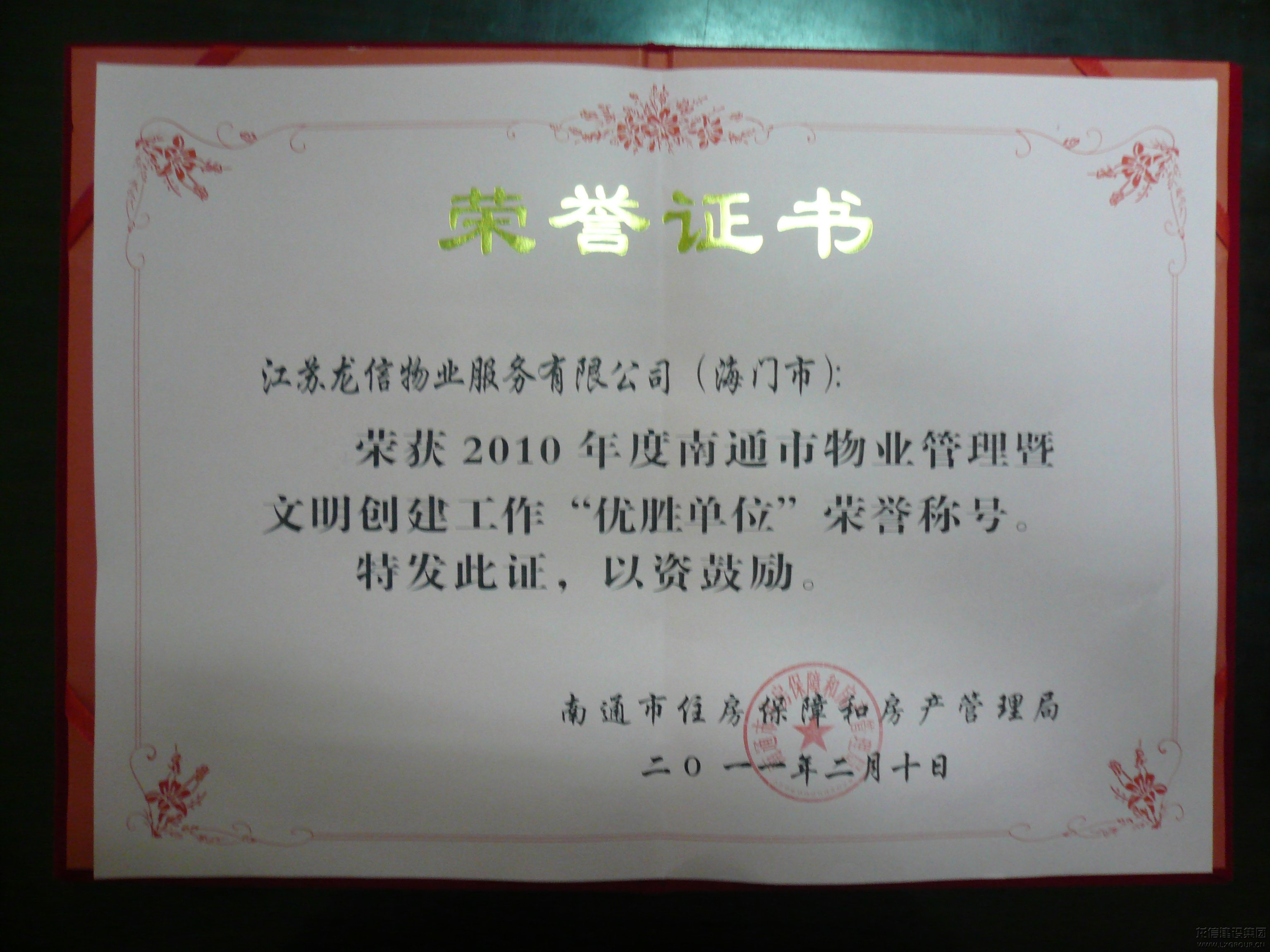 日前,在南通市房管局組織的物業(yè)行業(yè)大會(huì)上,江蘇龍信物業(yè)被評(píng)為2010年度“南通市物業(yè)管理優(yōu)勝單位”;同時(shí),海門“運(yùn)杰龍馨園”也捧回了2010年度“南通市物業(yè)管理優(yōu)秀小區(qū)”的獎(jiǎng)牌。