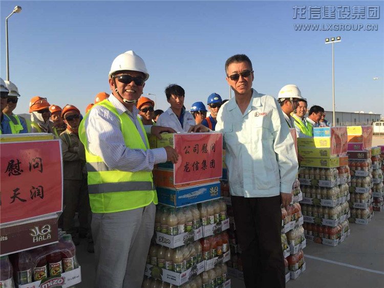 此次慰問活動中,楊清林主席走到龍信隊伍前,與龍信集團(tuán)海外公司領(lǐng)導(dǎo)楊秉法與仇勇經(jīng)理進(jìn)行了親切交談。他高興地表示:龍信在5家土建分包單位中任務(wù)很重,成績顯著、工作領(lǐng)先,對400多名龍信建設(shè)者付出的努力給予肯定和贊賞,對楊局親臨生產(chǎn)一線,駐守在環(huán)境如此惡劣的沙北工作表示感謝!隨后楊主席與龍信的同志們進(jìn)行了合影。